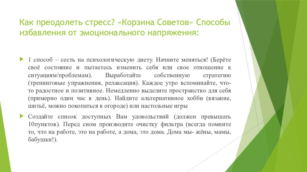 Слайд 11: Как преодолеть стресс? «Корзина Советов» Способы избавления от эмоционального напряжения: