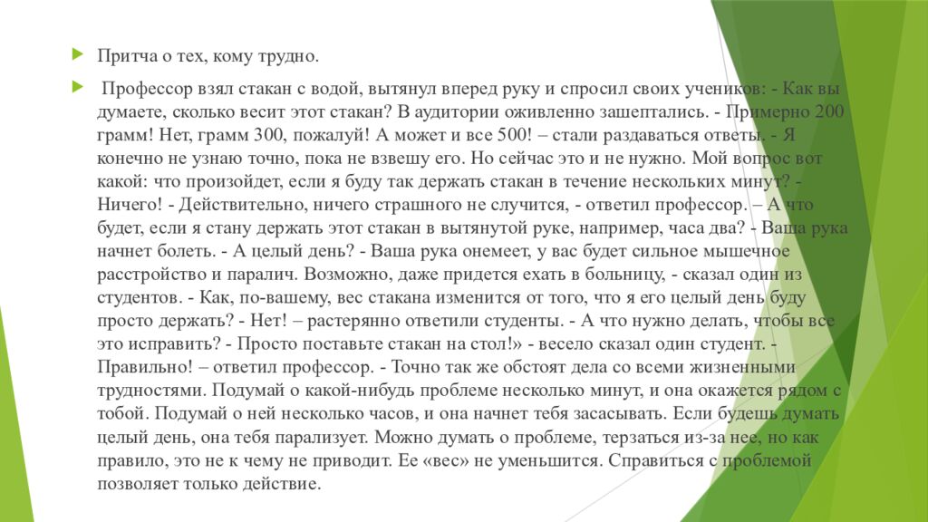 Притча о тех, кому трудно. Профессор взял стакан с водой, вытянул вперед руку и спросил своих учеников: - Как вы думаете, сколько весит этот стакан? В аудитории оживленно зашептались. - Примерно 200 грамм! Нет, грамм 300, пожалуй! А может и все 500! – стали раздаваться ответы. - Я конечно не узнаю точно, пока не взвешу его. Но сейчас это и не нужно. Мой вопрос вот какой: что произойдет, если я буду так держать стакан в течение нескольких минут? - Ничего! - Действительно, ничего страшного не случится, - ответил профессор. – А что будет, если я стану держать этот стакан в вытянутой руке, например, часа два? - Ваша рука начнет болеть. - А целый день? - Ваша рука онемеет, у вас будет сильное мышечное расстройство и паралич. Возможно, даже придется ехать в больницу, - сказал один из студентов. - Как, по-вашему, вес стакана изменится от того, что я его целый день буду просто держать? - Нет! – растерянно ответили студенты. - А что нужно делать, чтобы все это исправить? - Просто поставьте стакан на стол!» - весело сказал один студент. - Правильно! – ответил профессор. - Точно так же обстоят дела со всеми жизненными трудностями. Подумай о какой-нибудь проблеме несколько минут, и она окажется рядом с тобой. Подумай о ней несколько часов, и она начнет тебя засасывать. Если будешь думать целый день, она тебя парализует. Можно думать о проблеме, терзаться из-за нее, но как правило, это не к чему не приводит. Ее «вес» не уменьшится. Справиться с проблемой позволяет только действие.