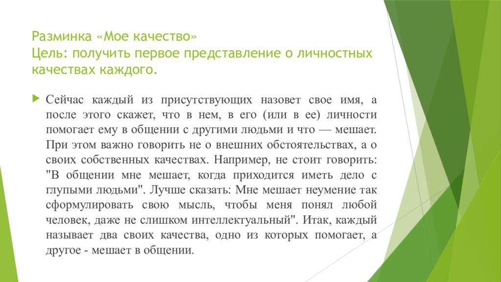 Сейчас каждый из присутствующих назовет свое имя, а после этого скажет, что в нем, в его (или в ее) личности помогает ему в общении с другими людьми и что — мешает. При этом важно говорить не о внешних обстоятельствах, а о своих собственных качествах. Например, не стоит говорить: "В общении мне мешает, когда приходится иметь дело с глупыми людьми". Лучше сказать: Мне мешает неумение так сформулировать свою мысль, чтобы меня понял любой человек, даже не слишком интеллектуальный". Итак, каждый называет два своих качества, одно из которых помогает, а другое - мешает в общении.