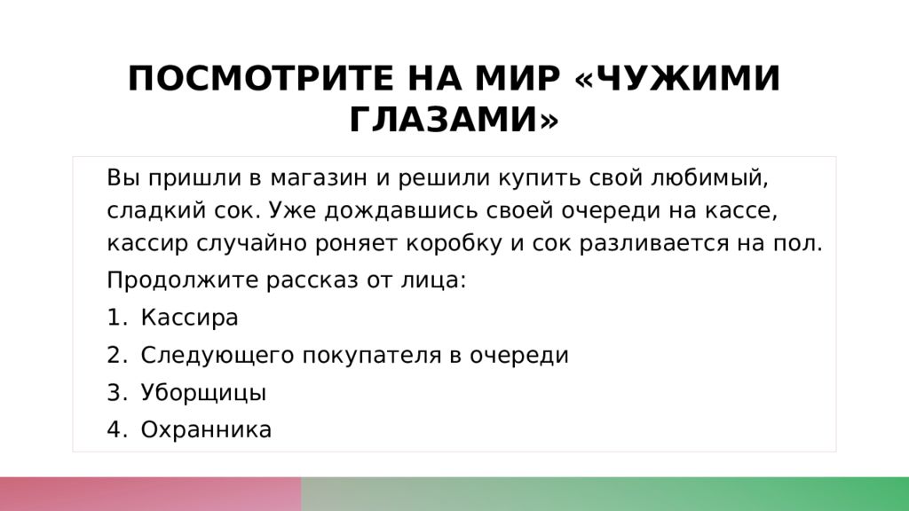Вы пришли в магазин и решили купить свой любимый, сладкий сок. Уже дождавшись своей очереди на кассе, кассир случайно роняет коробку и сок разливается на пол. Продолжите рассказ от лица: Кассира Следующего покупателя в очереди Уборщицы Охранника