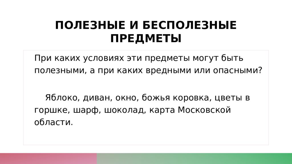При каких условиях эти предметы могут быть полезными, а при каких вредными или опасными? Яблоко, диван, окно, божья коровка, цветы в горшке, шарф, шоколад, карта Московской области.