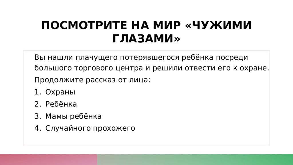 Вы нашли плачущего потерявшегося ребёнка посреди большого торгового центра и решили отвести его к охране. Продолжите рассказ от лица: Охраны Ребёнка Мамы ребёнка Случайного прохожего