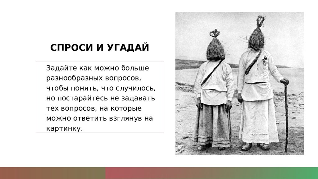 Задайте как можно больше разнообразных вопросов, чтобы понять, что случилось, но постарайтесь не задавать тех вопросов, на которые можно ответить взглянув на картинку.