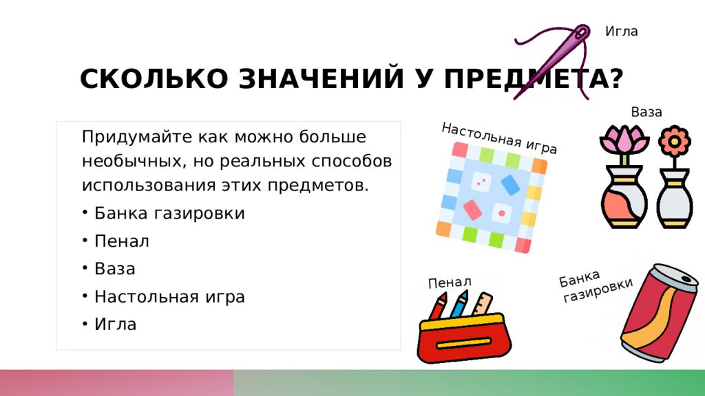 Придумайте как можно больше необычных, но реальных способов использования этих предметов. Банка газировки Пенал Ваза Настольная игра Игла Игла Ваза Пенал Настольная игра Банка газировки