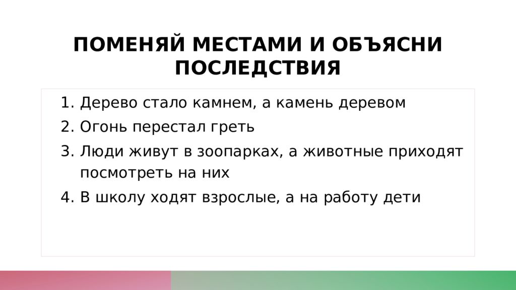 Дерево стало камнем, а камень деревом Огонь перестал греть Люди живут в зоопарках, а животные приходят посмотреть на них В школу ходят взрослые, а на работу дети