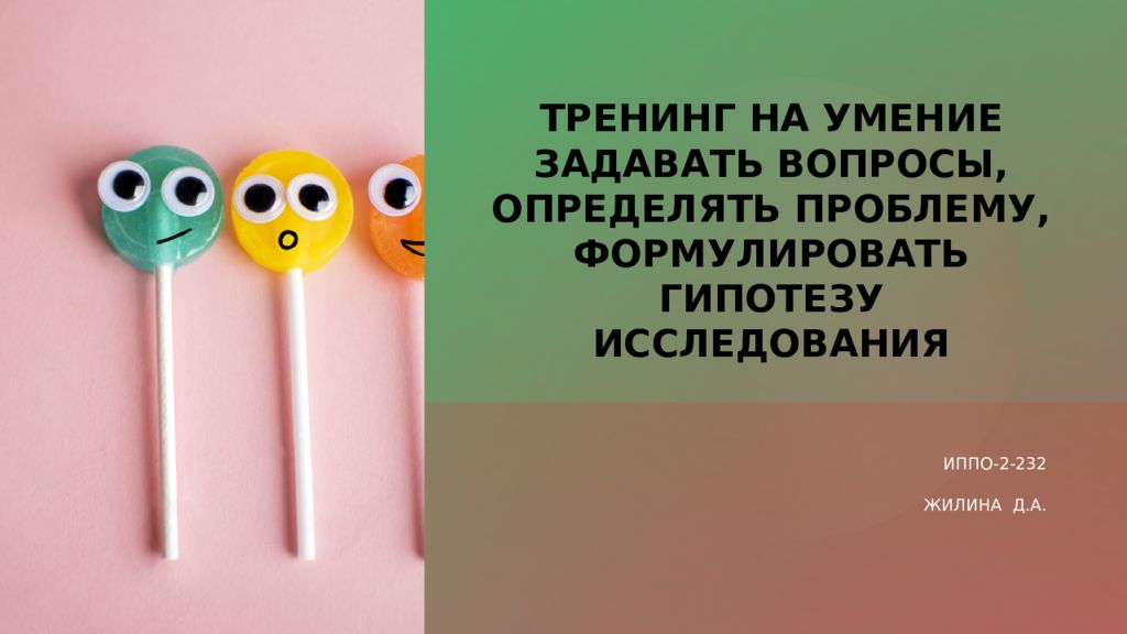 Первый слайд презентации: ТРЕНИНГ НА УМЕНИЕ задавать вопросы, ОПРЕДЕЛЯТЬ ПРОБЛЕМУ, ФОРМУЛИРОВАТЬ ГИПОТЕЗУ ИССЛЕДОВАНИЯ