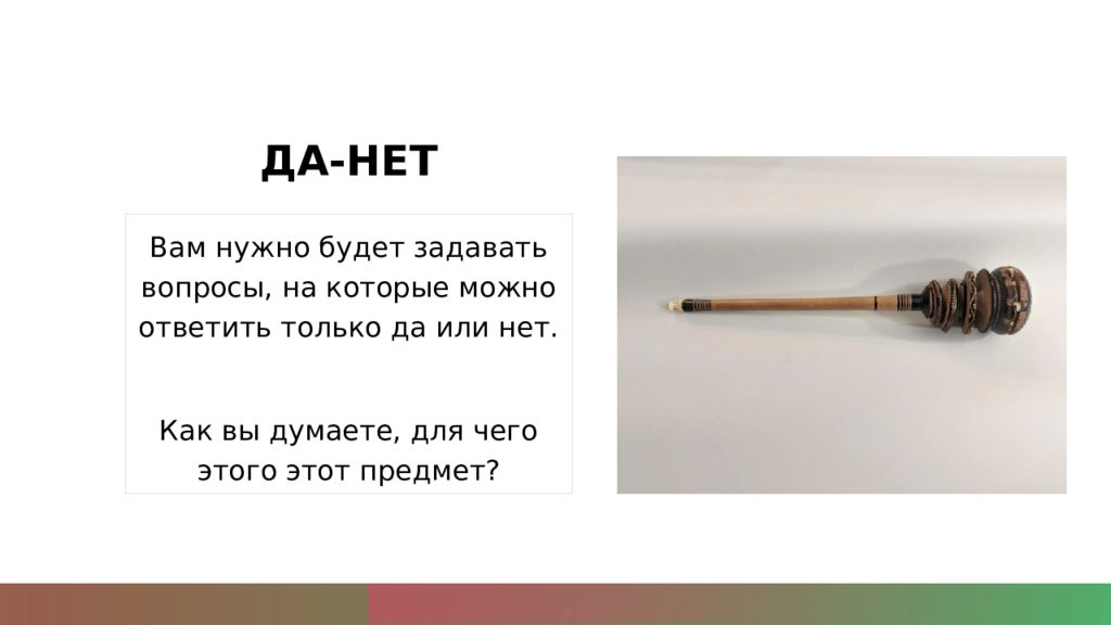 Вам нужно будет задавать вопросы, на которые можно ответить только да или нет. Как вы думаете, для чего этого этот предмет?