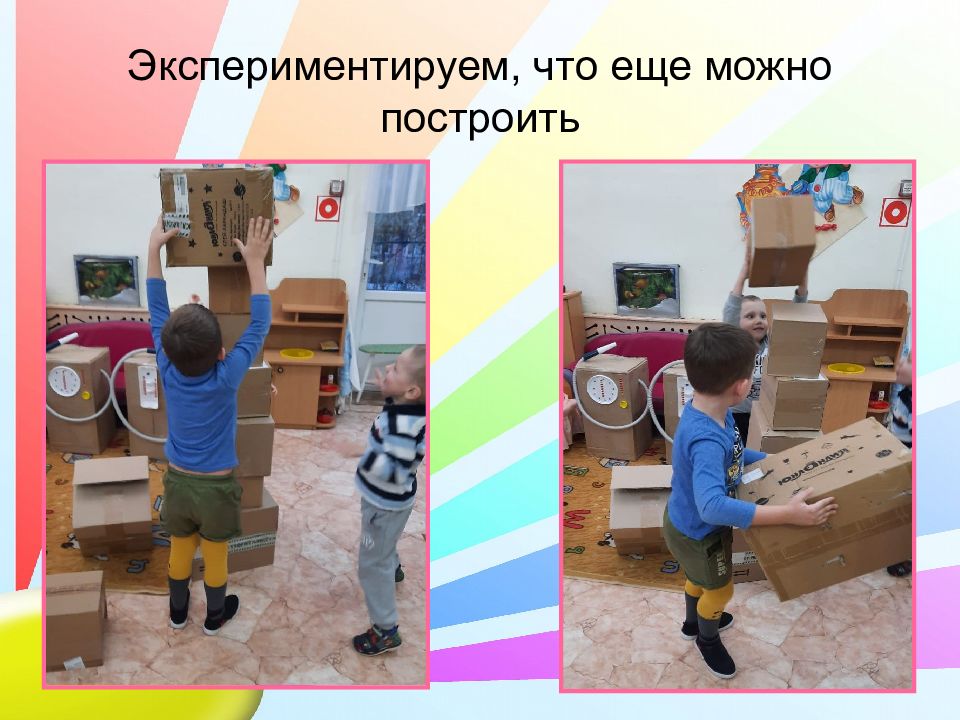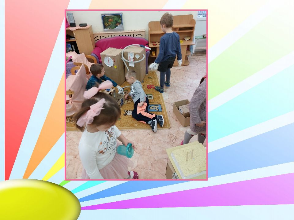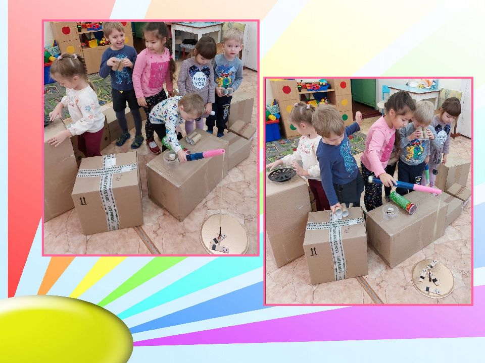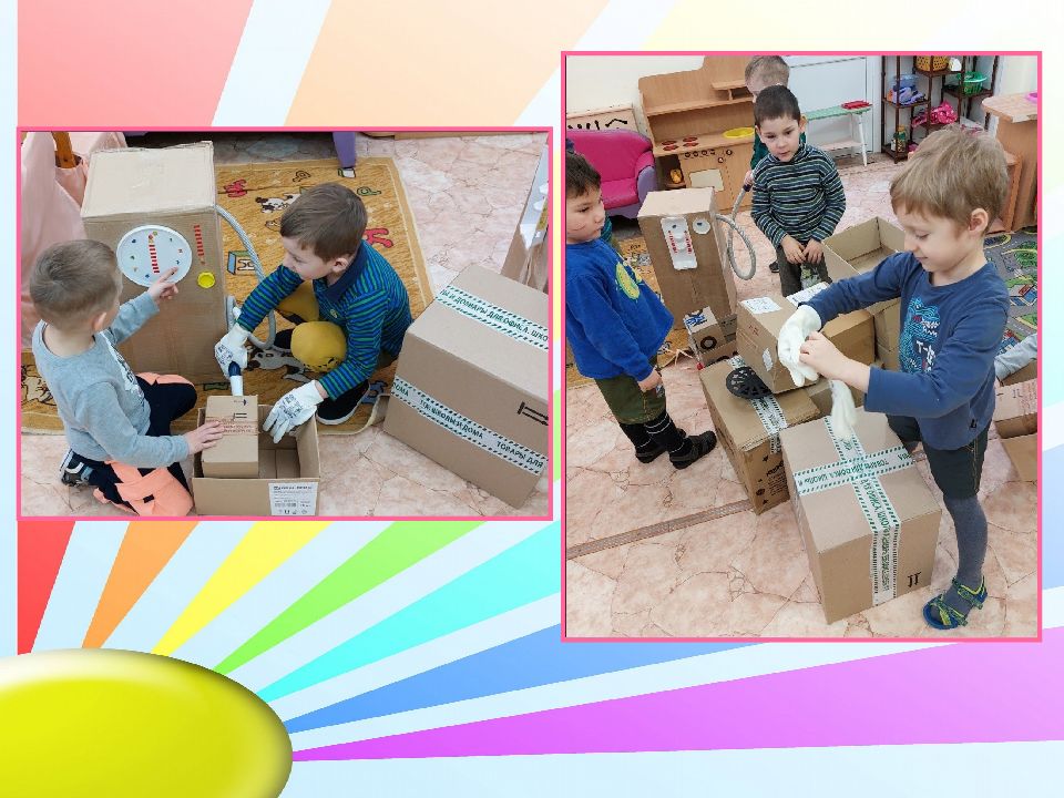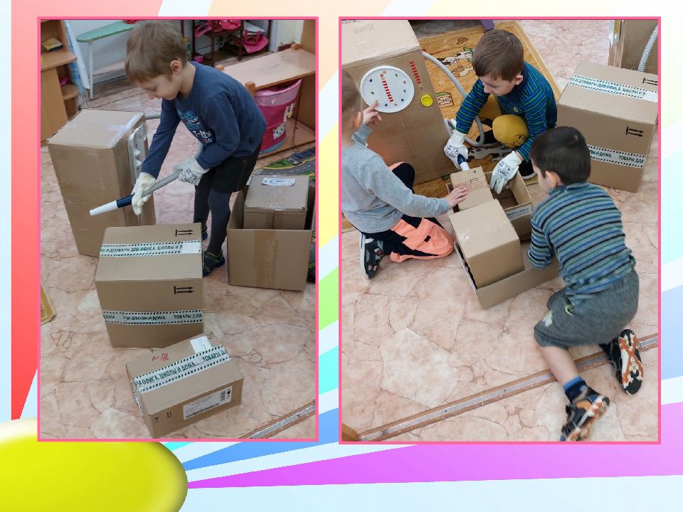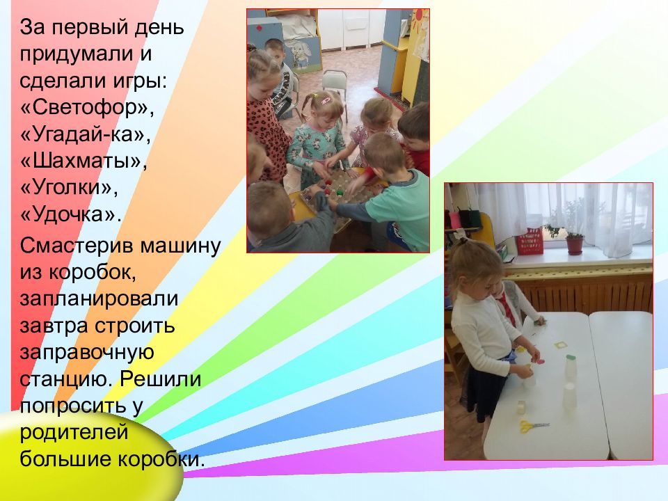 За первый день придумали и сделали игры: «Светофор», «Угадай-ка», «Шахматы», «Уголки», «Удочка». Смастерив машину из коробок, запланировали завтра строить заправочную станцию. Решили попросить у родителей большие коробки.