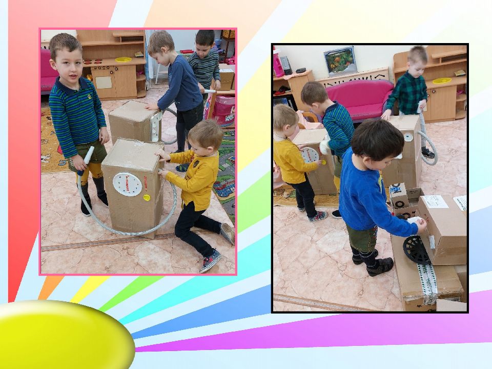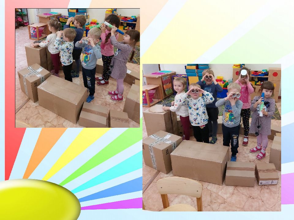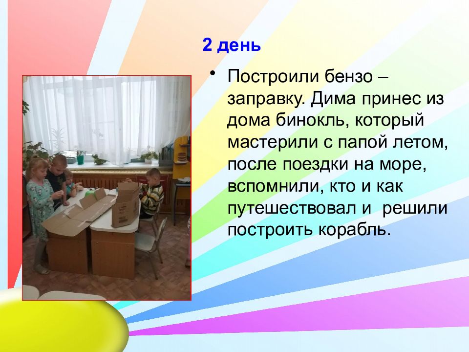 Построили бензо – заправку. Дима принес из дома бинокль, который мастерили с папой летом, после поездки на море, вспомнили, кто и как путешествовал и решили построить корабль.