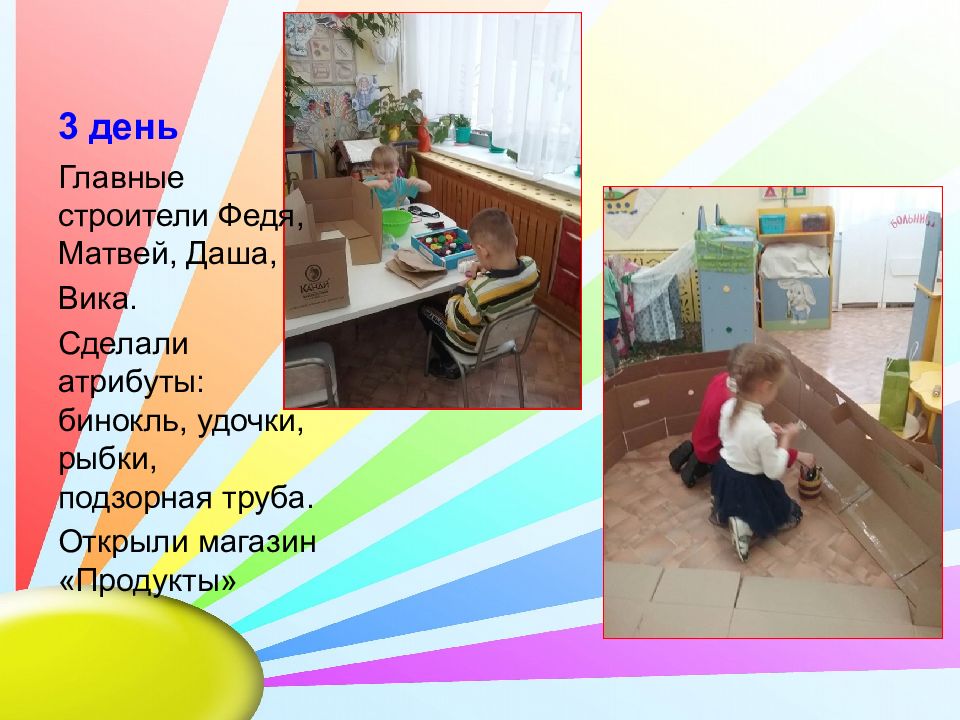 Главные строители Федя, Матвей, Даша, Вика. Сделали атрибуты: бинокль, удочки, рыбки, подзорная труба. Открыли магазин «Продукты»