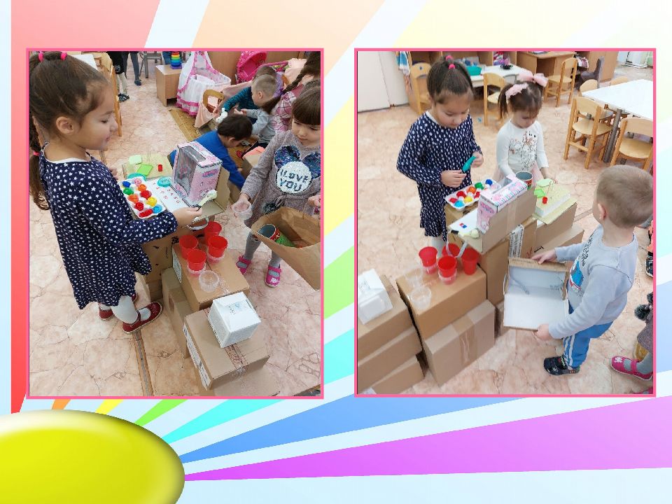 В первый день, самостоятельно решили делать настольные игры, предметы заместители своих любимых игрушек. Играли подгруппами по интересам, затем звали к себе других ребят.