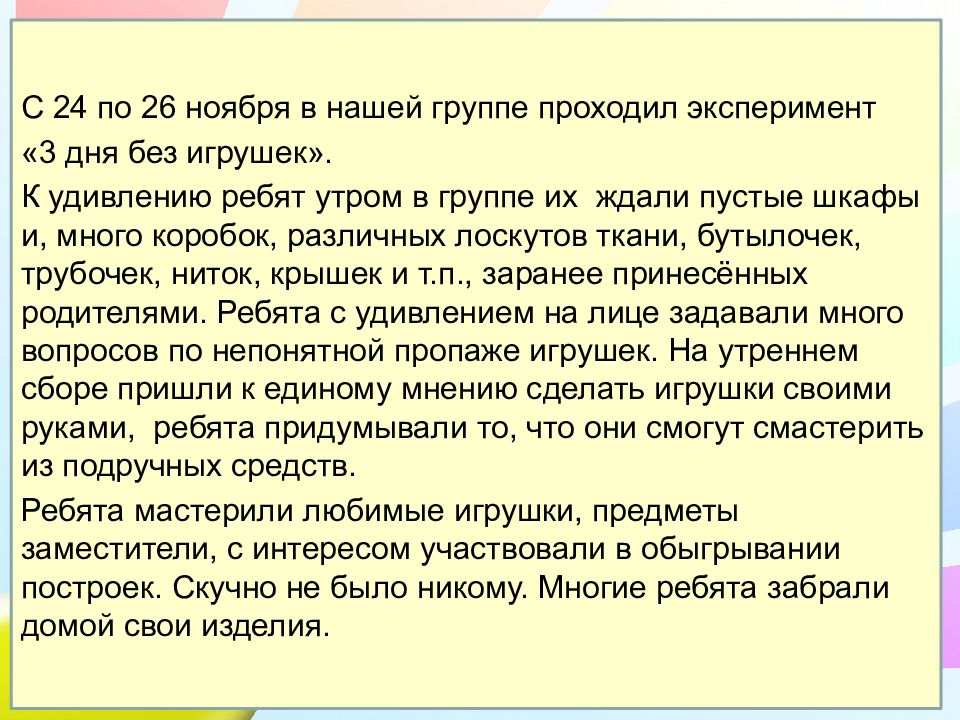 С 24 по 26 ноября в нашей группе проходил эксперимент «3 дня без игрушек». К удивлению ребят утром в группе их ждали пустые шкафы и, много коробок, различных лоскутов ткани, бутылочек, трубочек, ниток, крышек и т.п., заранее принесённых родителями. Ребята с удивлением на лице задавали много вопросов по непонятной пропаже игрушек. На утреннем сборе пришли к единому мнению сделать игрушки своими руками, ребята придумывали то, что они смогут смастерить из подручных средств. Ребята мастерили любимые игрушки, предметы заместители, с интересом участвовали в обыгрывании построек. Скучно не было никому. Многие ребята забрали домой свои изделия.