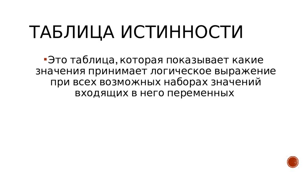 Это таблица, которая показывает какие значения принимает логическое выражение при всех возможных наборах значений входящих в него переменных