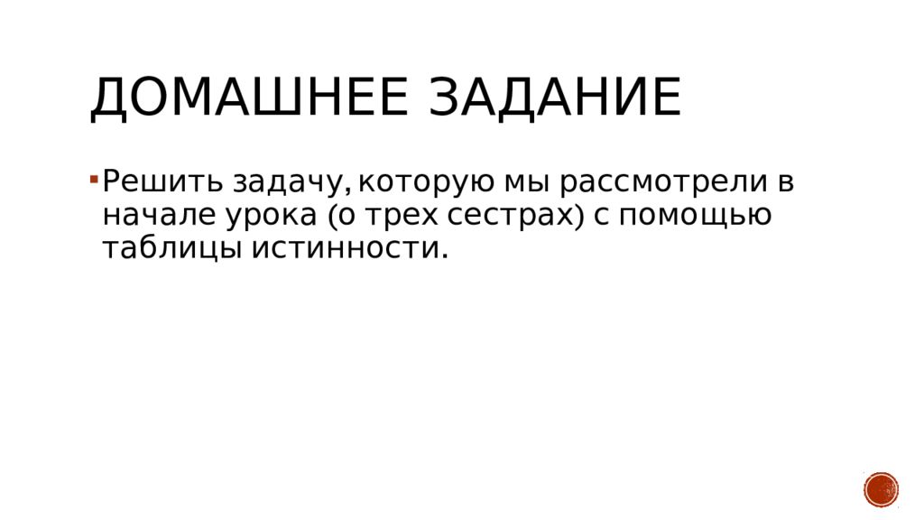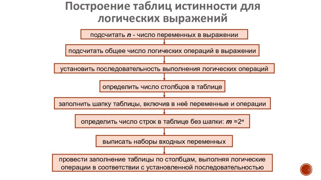 Построение таблиц истинности для логических выражений подсчитать n - число переменных в выражении подсчитать общее число логических операций в выражении установить последовательность выполнения логических операций определить число столбцов в таблице заполнить шапку таблицы, включив в неё переменные и операции определить число строк в таблице без шапки: m =2 n выписать наборы входных переменных провести заполнение таблицы по столбцам, выполняя логические операции в соответствии с установленной последовательностью