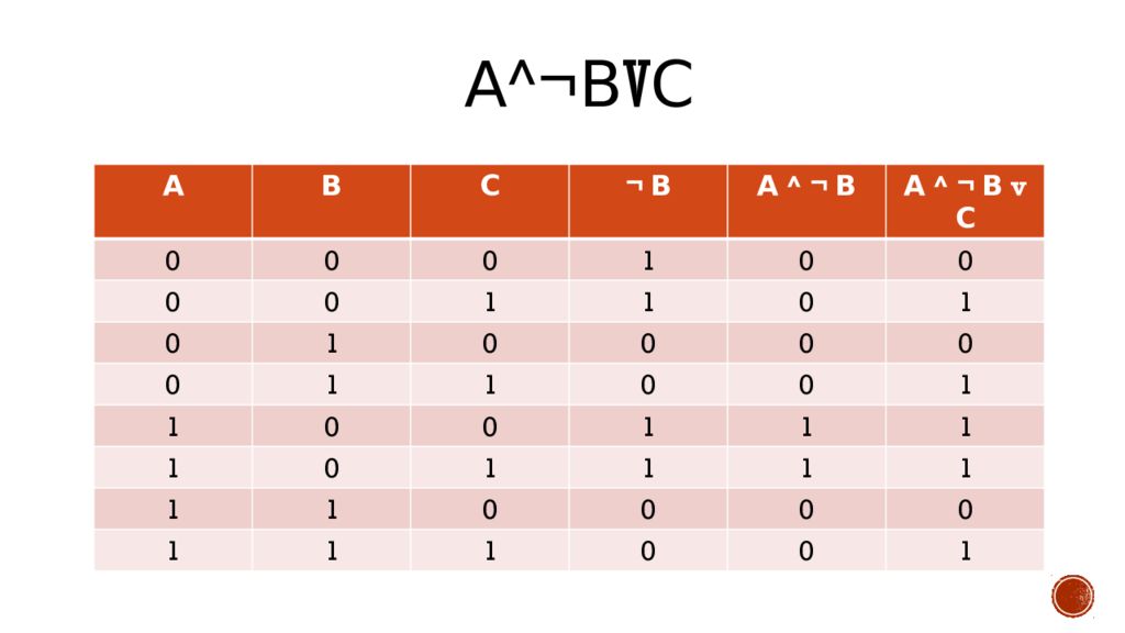 А В С ¬ В А ^ ¬ В А ^ ¬ В v С 0 0 0 1 0 0 0 0 1 1 0 1 0 1 0 0 0 0 0 1 1 0 0 1 1 0 0 1 1 1 1 0 1 1 1 1 1 1 0 0 0 0 1 1 1 0 0 1