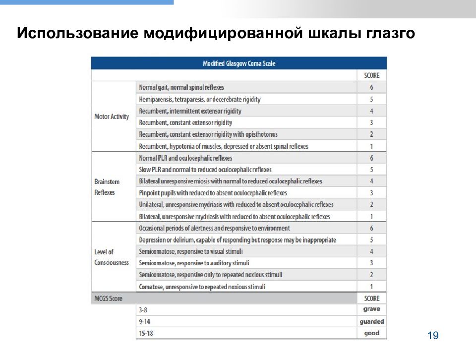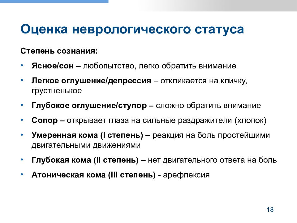 Степень сознания: Ясное / сон – любопытство, легко обратить внимание Легкое оглушение / депрессия – откликается на кличку, грустненькое Глубокое оглушение / ступор – сложно обратить внимание Сопор – открывает глаза на сильные раздражители (хлопок) Умеренная кома ( I степень) – реакция на боль простейшими двигательными движениями Глубокая кома ( II степень) – нет двигательного ответа на боль Атоническая кома ( III степень) - арефлексия 18