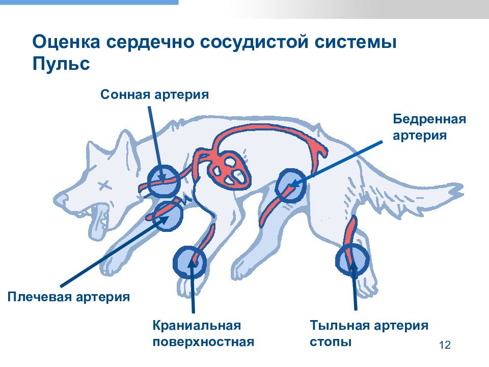 12 Бедренная артерия Сонная артерия Плечевая артерия Краниальная поверхностная Тыльная артерия стопы
