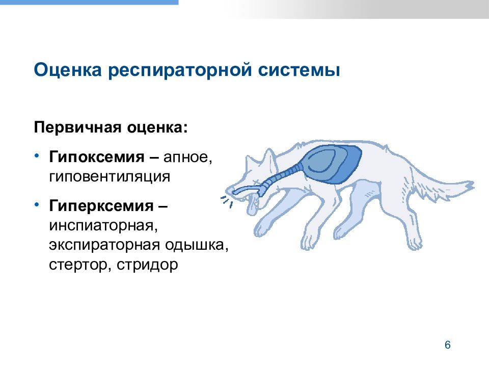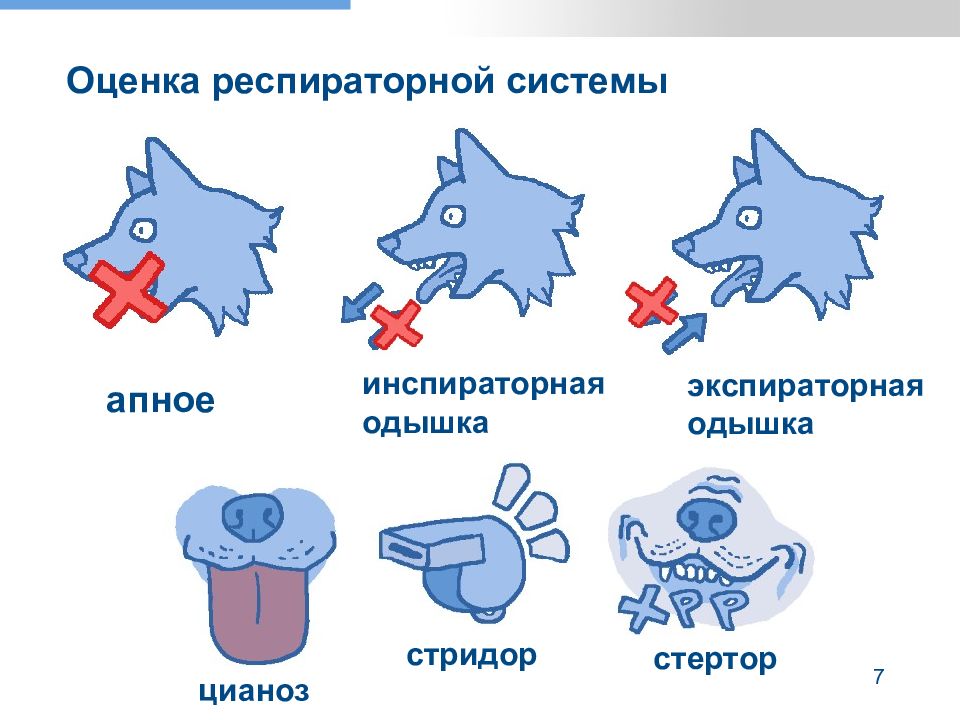 Первичная оценка: Гипоксемия – апное, гиповентиляция Гиперксемия – инспиаторная, экспираторная одышка, стертор, стридор 6