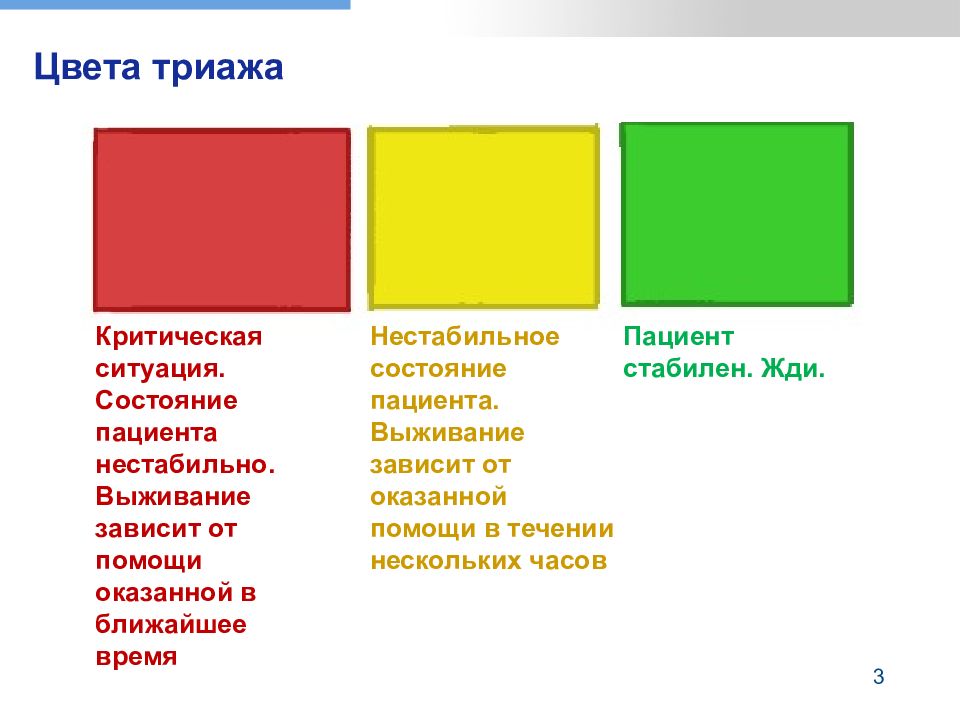 3 Цвета триажа Критическая ситуация. Состояние пациента нестабильно. Выживание зависит от помощи оказанной в ближайшее время Нестабильное состояние пациента. Выживание зависит от оказанной помощи в течении нескольких часов Пациент стабилен. Жди.
