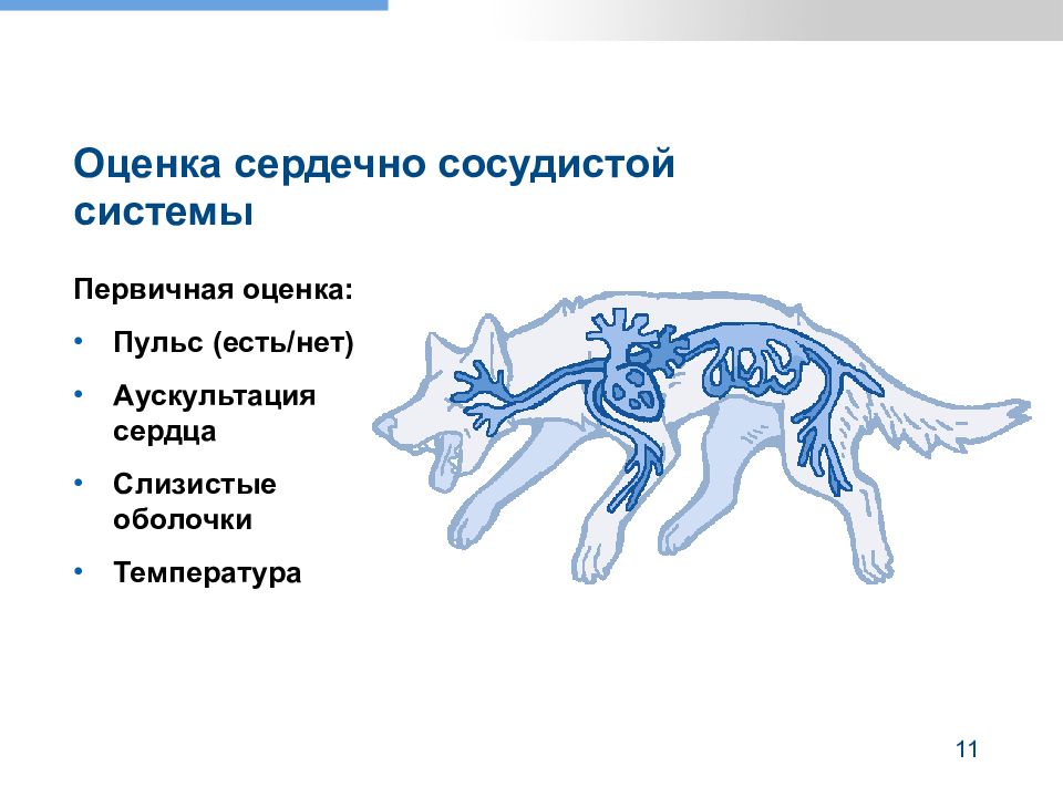 Первичная оценка: Пульс (есть / нет) Аускультация сердца Слизистые оболочки Температура 11