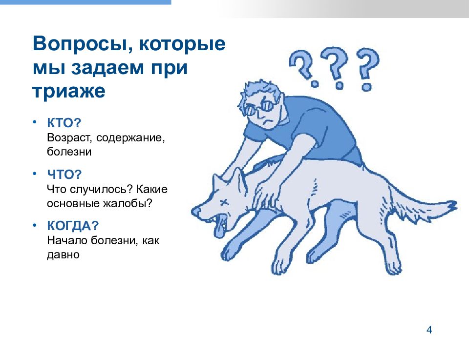 КТО? Вид, возраст, пол, болезни Открытый вопрос: Что случилось? Вопросы да / нет: Кровь идет? Встает на ноги? Исключение жизнеугрожающих состояний Дышит? Язык синий? 5