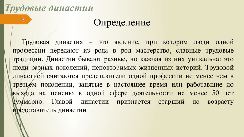 Трудовые династии Определение Трудовая династия – это явление, при котором люди одной профессии передают из рода в род мастерство, славные трудовые традиции. Династии бывают разные, но каждая из них уникальна: это люди разных поколений, неповторимых жизненных историй. Трудовой династией считаются представители одной профессии не менее чем в третьем поколении, занятые в настоящее время или работавшие до выхода на пенсию в одной сфере деятельности не менее 50 лет суммарно. Главой династии признается старший по возрасту представитель династии 3