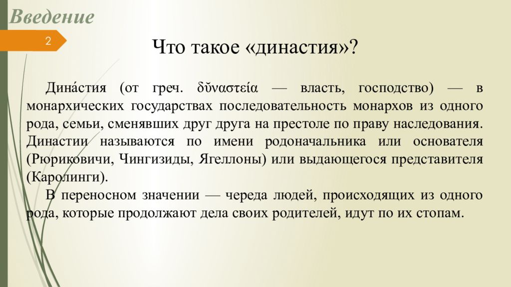 Введение Что такое «династия»? Дина́стия (от греч. δῠν αστεία — власть, господство) — в монархических государствах последовательность монархов из одного рода, семьи, сменявших друг друга на престоле по праву наследования. Династии называются по имени родоначальника или основателя (Рюриковичи, Чингизиды, Ягеллоны) или выдающегося представителя (Каролинги). В переносном значении — череда людей, происходящих из одного рода, которые продолжают дела своих родителей, идут по их стопам. 2