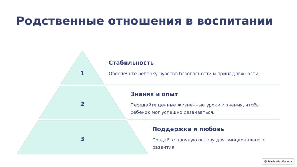 Родственные отношения в воспитании 1 Стабильность Обеспечьте ребенку чувство безопасности и принадлежности. 2 Знания и опыт Передайте ценные жизненные уроки и знания, чтобы ребенок мог успешно развиваться. 3 Поддержка и любовь Создайте прочную основу для эмоционального развития.