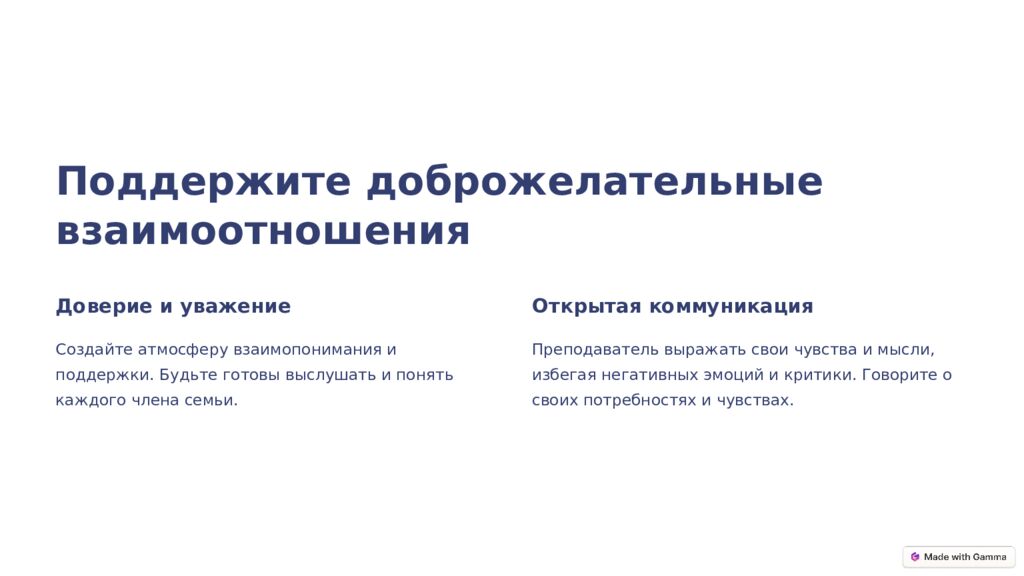 Поддержите доброжелательные взаимоотношения Доверие и уважение Создайте атмосферу взаимопонимания и поддержки. Будьте готовы выслушать и понять каждого члена семьи. Открытая коммуникация Преподаватель выражать свои чувства и мысли, избегая негативных эмоций и критики. Говорите о своих потребностях и чувствах.