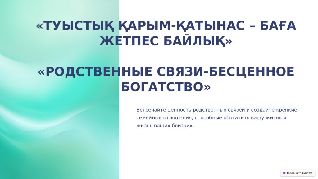 « ТУЫСТЫҚ ҚАРЫМ - ҚАТЫНАС – БАҒА ЖЕТПЕС БАЙЛЫҚ» « РОДСТВЕННЫЕ СВЯЗИ- БЕC ЦЕННОЕ БОГАТСТВО» Встречайте ценность родственных связей и создайте крепкие семейные отношения, способные обогатить вашу жизнь и жизнь ваших близких.