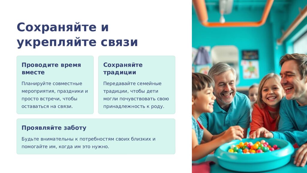 Сохраняйте и укрепляйте связи Проводите время вместе Планируйте совместные мероприятия, праздники и просто встречи, чтобы оставаться на связи. Сохраняйте традиции Передавайте семейные традиции, чтобы дети могли почувствовать свою принадлежность к роду. Проявляйте заботу Будьте внимательны к потребностям своих близких и помогайте им, когда им это нужно.