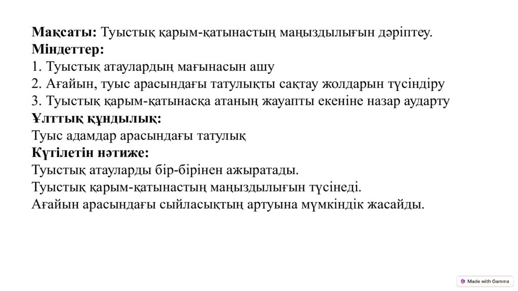 Мақсаты : Туыстық қарым - қатынастың маңыздылығын дәріптеу. Міндеттер : 1. Туыстық атаулардың мағынасын ашу 2. Ағайын, туыс арасындағы татулықты сақтау жолдарын түсіндіру 3. Туыстық қарым - қатынасқа атаның жауапты екеніне назар аударту Ұлттық құндылық : Туыс адамдар арасындағы татулық Күтілетін нәтиже : Туыстық атауларды бір - бірінен ажыратады. Туыстық қарым - қатынастың маңыздылығын түсінеді. Ағайын арасындағы сыйласықтың артуына мүмкіндік жасайды.
