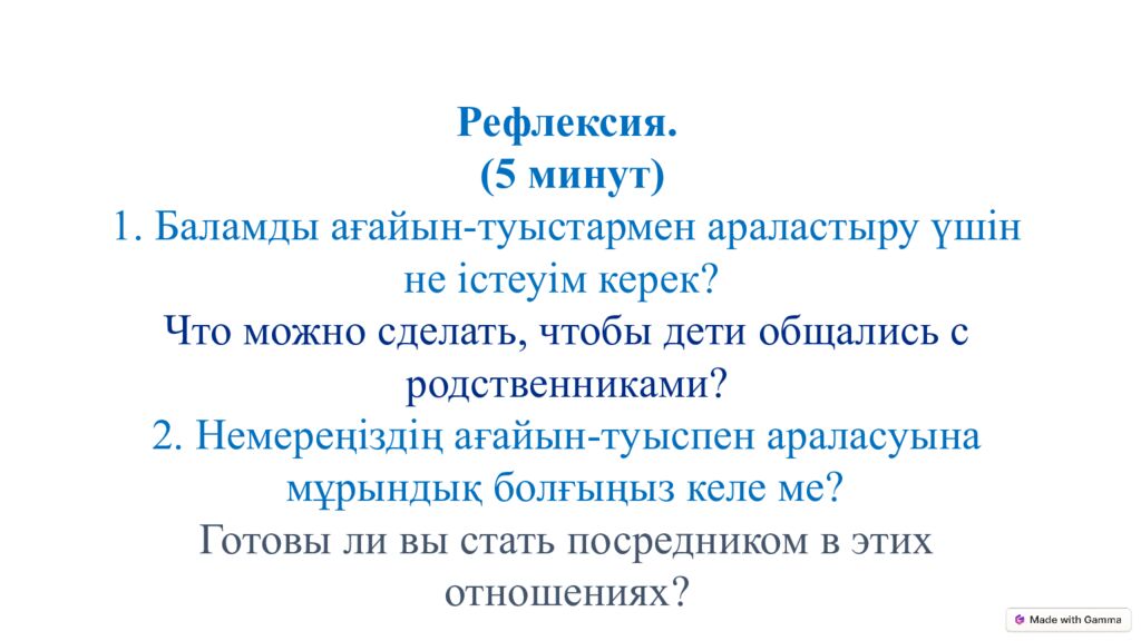 Рефлексия. (5 минут ) 1. Баламды ағайын - туыстармен араластыру үшін не істеуім керек ? Что можно сделать, чтобы дети общались с родственниками ? 2. Немереңіздің ағайын - туыспен араласуына мұрындық болғыңыз келе ме ? Готовы ли вы стать посредником в этих отношениях ?