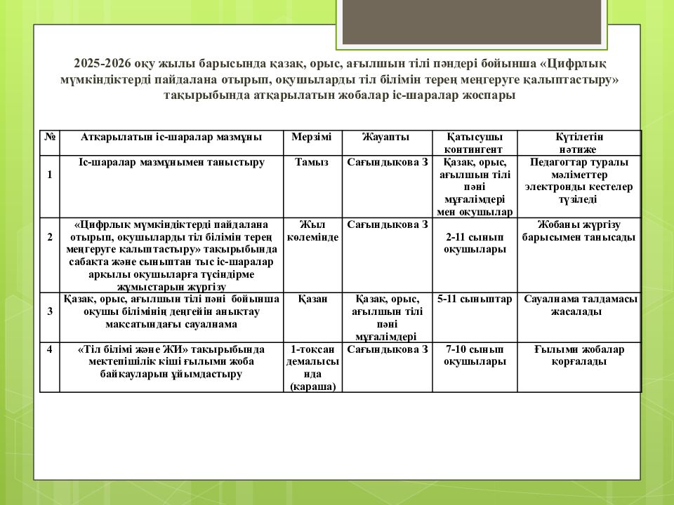 2025-2026 оқу жылы барысында қазақ, орыс, ағылшын тілі пәндері бойынша « Цифрлық мүмкіндіктерді пайдалана отырып, оқушыларды тіл білімін терең меңгеруге қалыптастыру » тақырыбында атқарылатын жобалар іс-шаралар жоспары № Атқарылатын іс-шаралар мазмұны Мерзімі Жауапты Қатысушы контингент Күтілетін нәтиже 1 Іс-шаралар мазмұнымен таныстыру Тамыз Сағындықова З Қазақ, орыс, ағылшын тілі пәні мұғалімдері мен оқушылар Педагогтар туралы мәліметтер электронды кестелер түзіледі 2 « Цифрлық мүмкіндіктерді пайдалана отырып, оқушыларды тіл білімін терең меңгеруге қалыптастыру » тақырыбында сабақта және сыныптан тыс іс-шаралар арқылы оқушыларға түсіндірме жұмыстарын жүргізу Жыл көлемінде Сағындықова З 2-11 сынып оқушылары Жобаны жүргізу барысымен танысады 3 Қазақ, орыс, ағылшын тілі пәні бойынша оқушы білімінің деңгейін анықтау мақсатындағы сауалнама Қазан Қазақ, орыс, ағылшын тілі пәні мұғалімдері 5-11 сыныптар Сауалнама талдамасы жасалады 4 «Тіл білімі және ЖИ» тақырыбында мектепішілік кіші ғылыми жоба байқауларын ұйымдастыру 1-тоқсан демалысында (қараша) Сағындықова З 7-10 сынып оқушылары Ғылыми жобалар қорғалады
