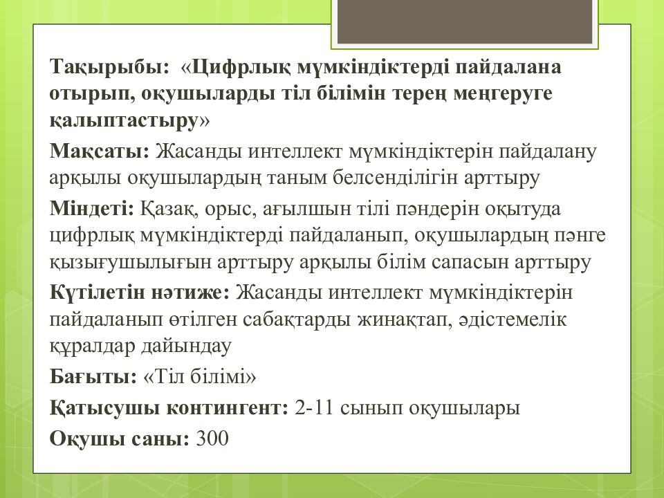 Тақырыбы: « Цифрлық мүмкіндіктерді пайдалана отырып, оқушыларды тіл білімін терең меңгеруге қалыптастыру » Мақсаты : Жасанды интеллект мүмкіндіктерін пайдалану арқылы оқушылардың таным белсенділігін арттыру Міндеті : Қазақ, орыс, ағылшын тілі пәндерін оқытуда цифрлық мүмкіндіктерді пайдаланып, оқушылардың пәнге қызығушылығын арттыру арқылы білім сапасын арттыру Күтілетін нәтиже: Жасанды интеллект мүмкіндіктерін пайдаланып өтілген сабақтарды жинақтап, әдістемелік құралдар дайындау Бағыты : «Тіл білімі» Қатысушы контингент: 2-11 сынып оқушылары Оқушы саны: 300