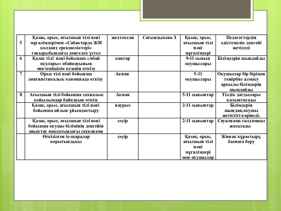 5 Қазақ, орыс, ағылшын тілі пәні мұғалімдерімен «Сабақтарда ЖИ қолдану ерекшеліктері» тақырыбындағы дөңгелек үстел желтоқсан Сағындықова З Қазақ, орыс, ағылшын тілі пәні мұғалімдері Педагогтердің әдістемелік деңгейі жетіледі 6 Қазақ тілі пәні бойынша «Абай оқулары» обайқауының мектепішілік кезеңін өткізу қаңтар 9-11 сынып оқушылары Білімдерін шыңдайды 7 Орыс тілі пәні бойынша лингвистикалық олимпиада өткізу Ақпан 5-11 оқушылары Оқушылар бір бірімен тәжірбие алмасу арқылы білімдерін шыңдайды 8 Ағылшын тілі бойынша сахналық қойылымдар байқауын өткізу Ақпан 5-11 сыныптар Тілдік дағдылары қалыптасады Қазақ, орыс, ағылшын тілі пәні бойынша айлық ұйымдастыру наурыз 2-11 сыныптар Білімдерін шыңдап,оқушы жетістігі көрінеді. Қазақ, орыс, ағылшын тілі пәні бойынша оқушы білімінің деңгейін анықтау мақсатындағы сауалнама сәуір 2-11 сыныптар Сауалнама талдамасы жасалады Өткізілген іс-шаралар қорытындысы сәуір Қазақ, орыс, ағылшын тілі пәні мұғалімдері мен оқушылар Жинақ құрастыру, баспаға беру