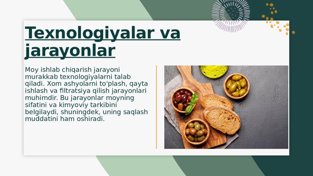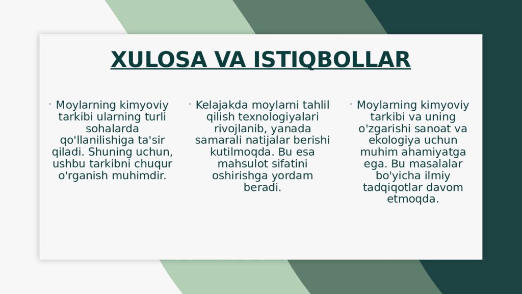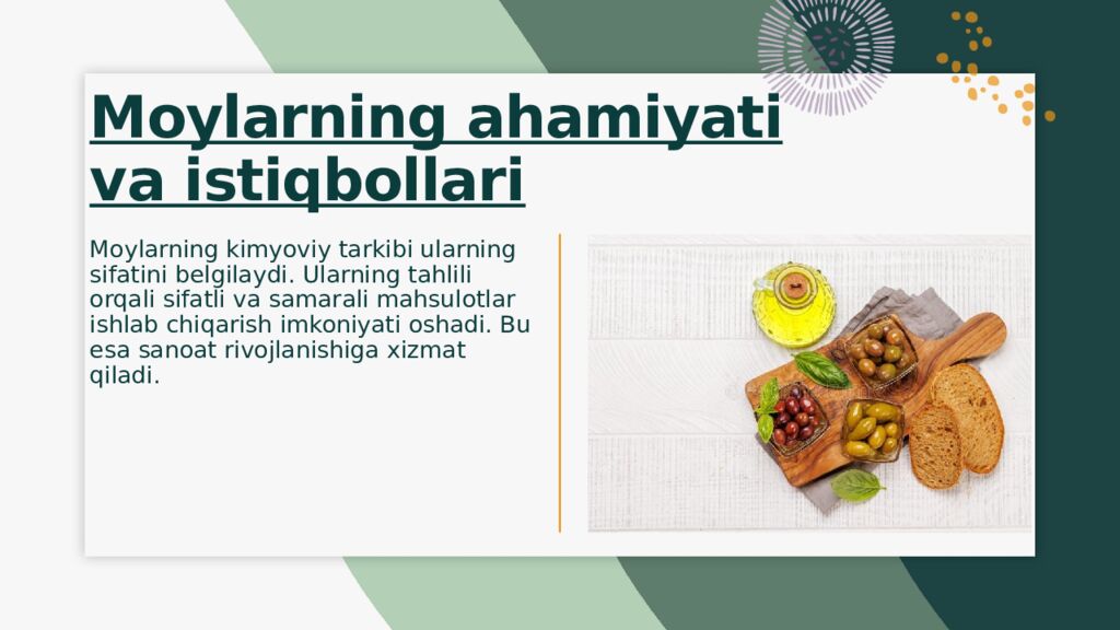 Слайд 25: Moylarning ahamiyati va istiqbollari