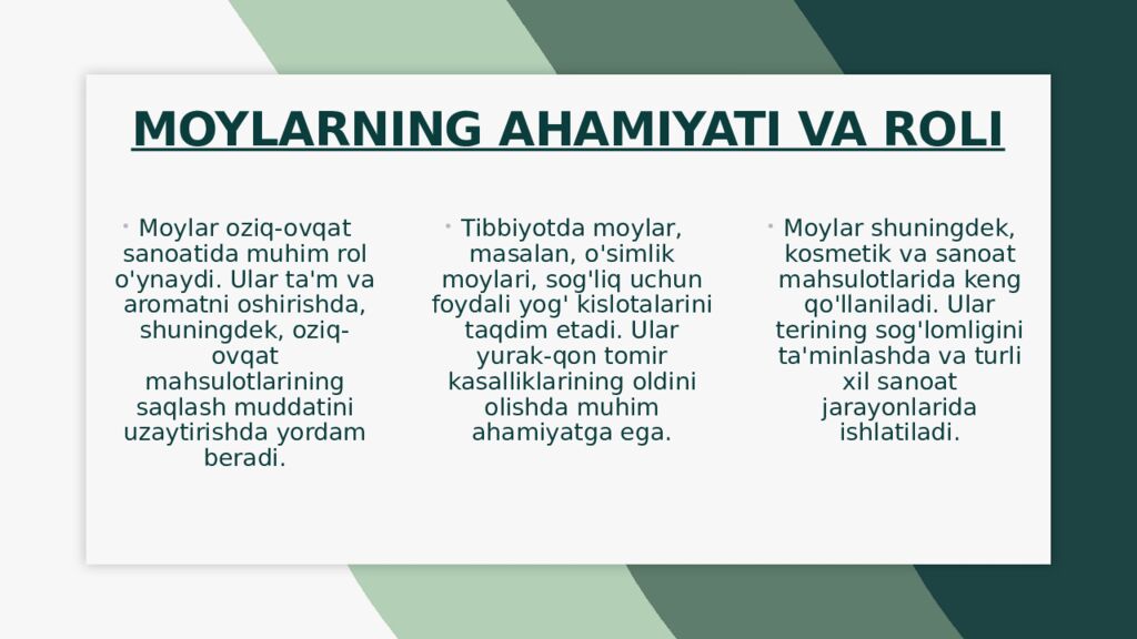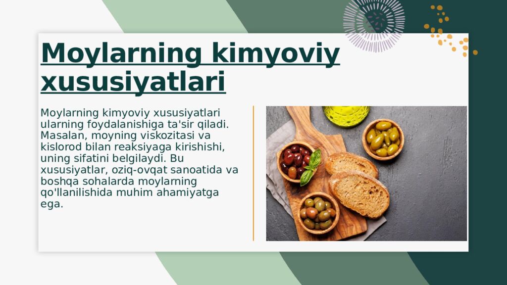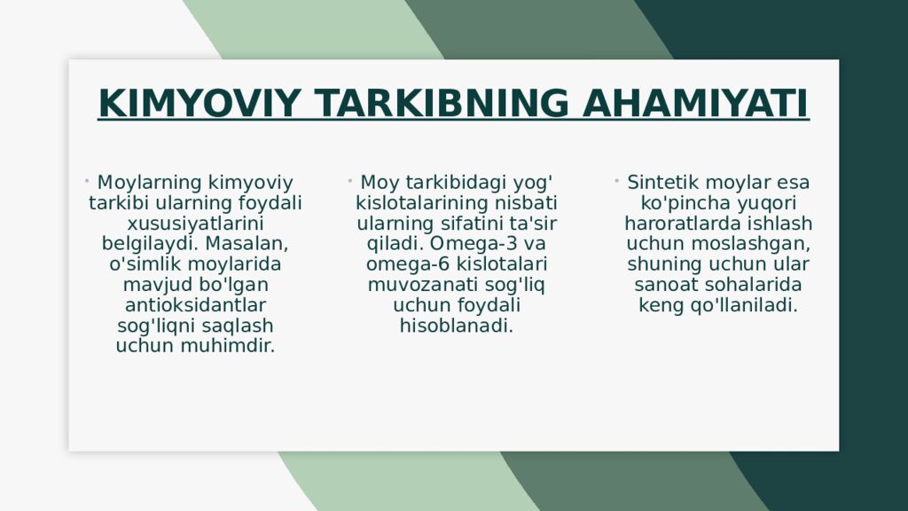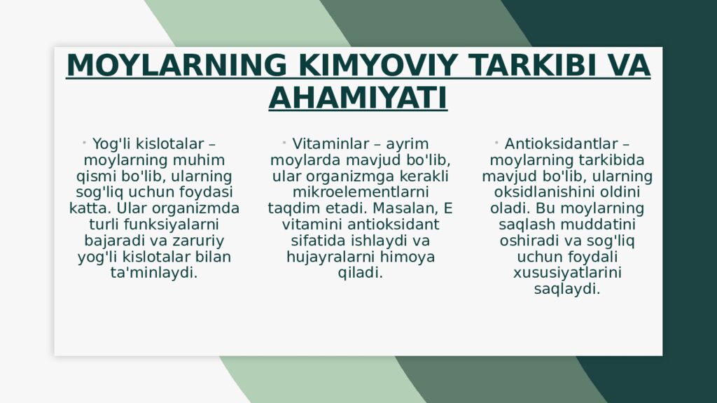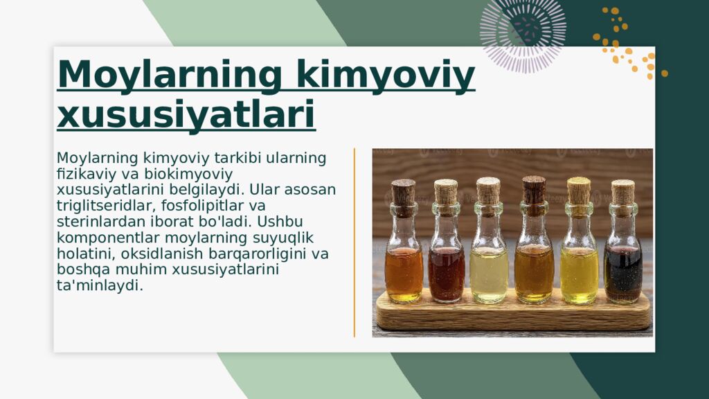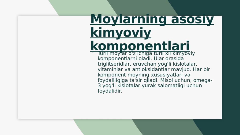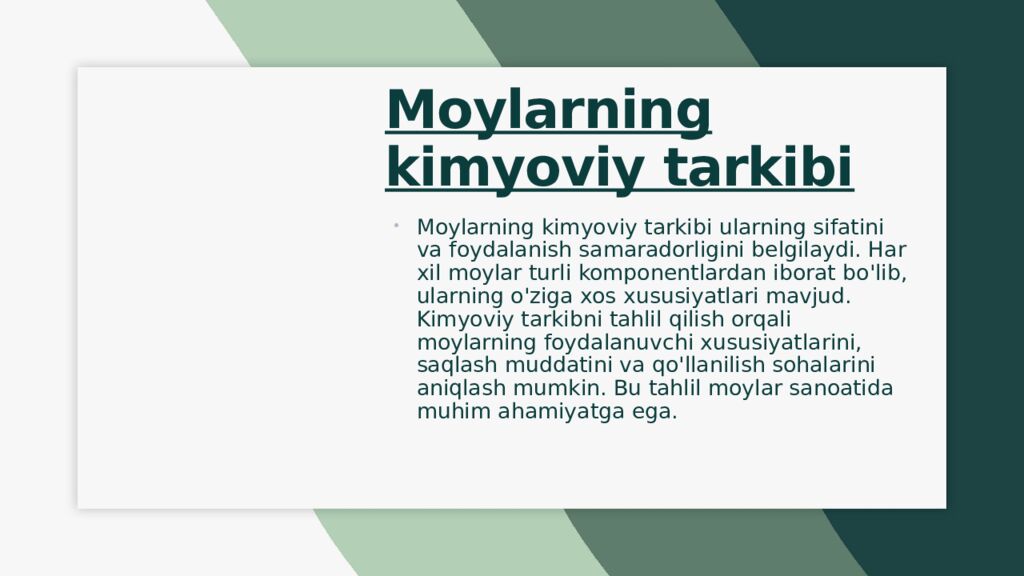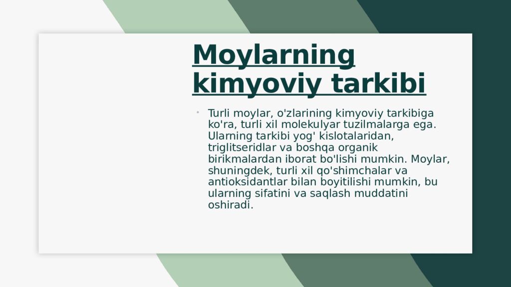 Слайд 10: Moylarning kimyoviy tarkibi va ahamiyati