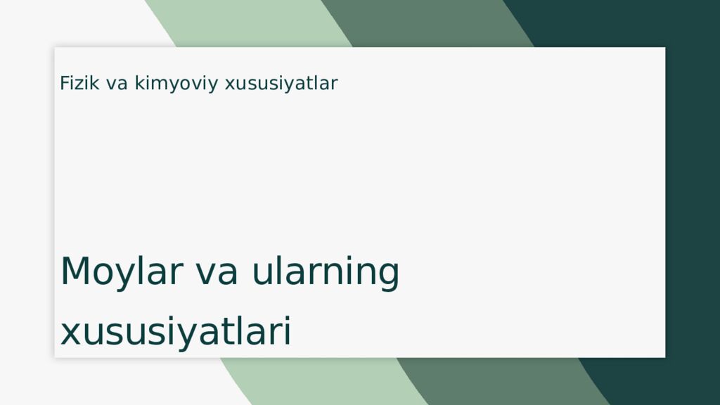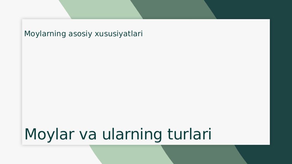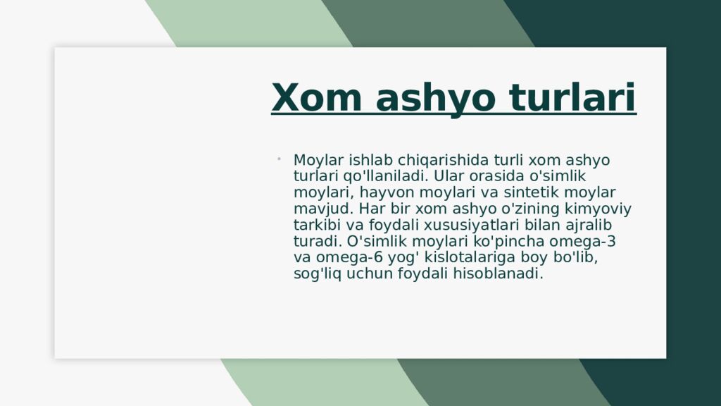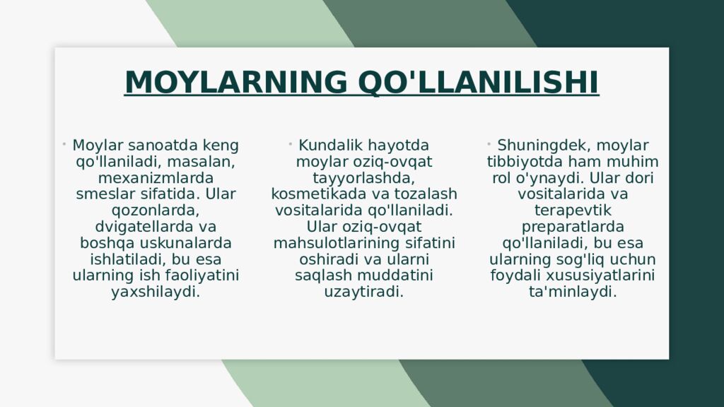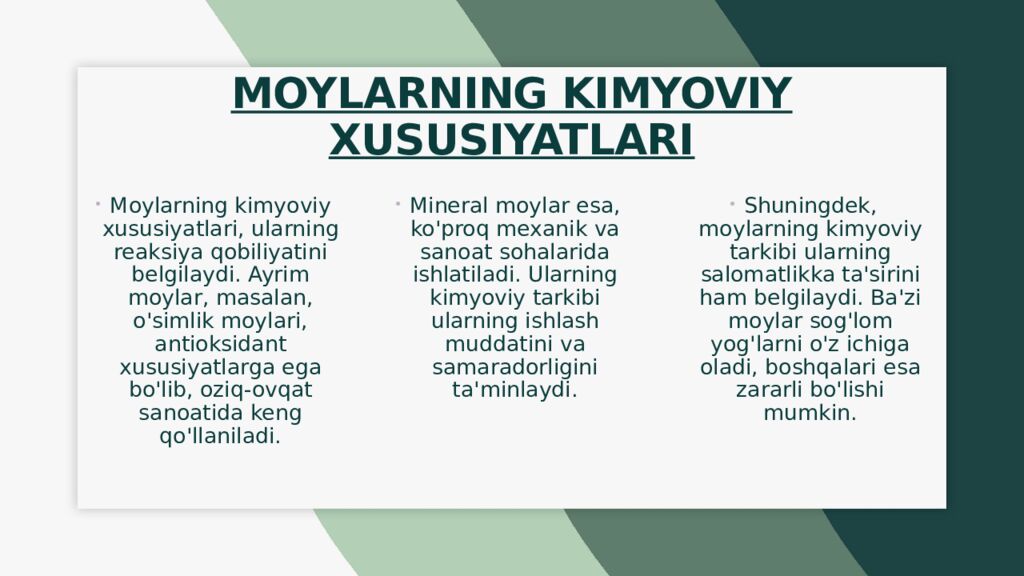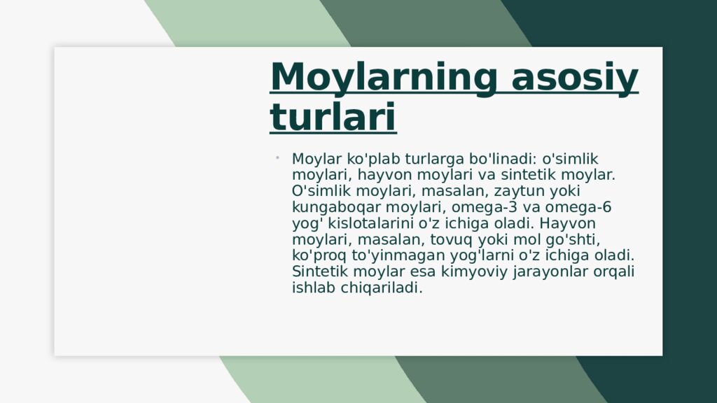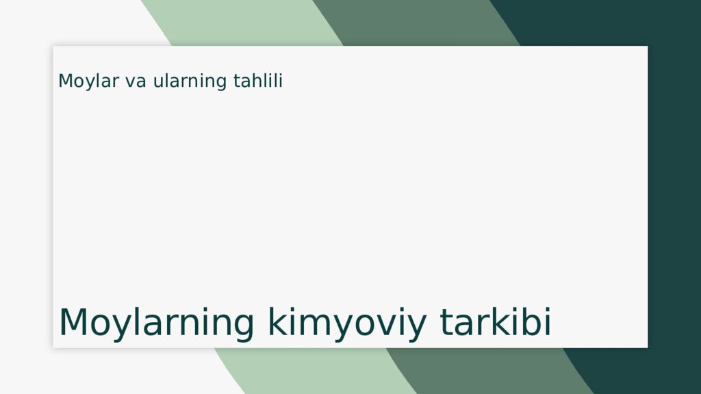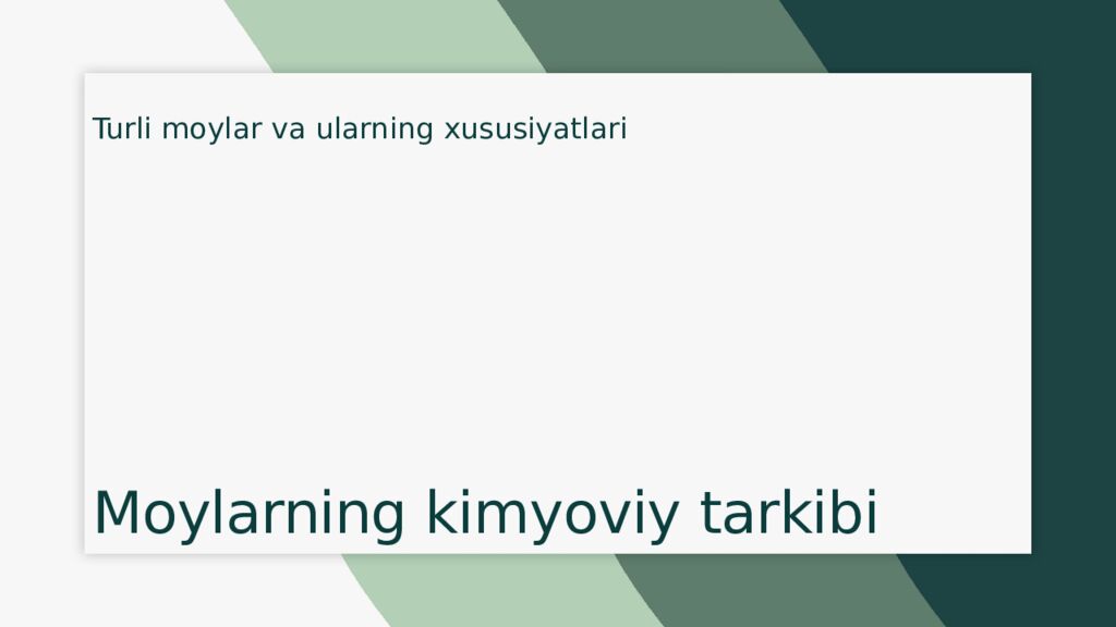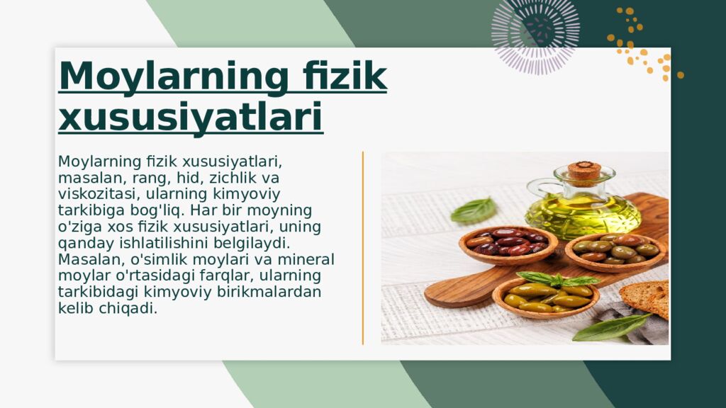 Слайд 10: Moylarning kimyoviy tarkibi va ahamiyati