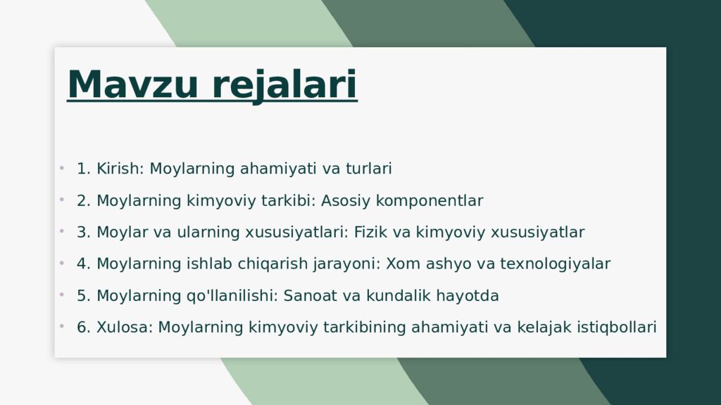 1. Kirish: Moylarning ahamiyati va turlari 2. Moylarning kimyoviy tarkibi: Asosiy komponentlar 3. Moylar va ularning xususiyatlari: Fizik va kimyoviy xususiyatlar 4. Moylarning ishlab chiqarish jarayoni: Xom ashyo va texnologiyalar 5. Moylarning qo'llanilishi: Sanoat va kundalik hayotda 6. Xulosa: Moylarning kimyoviy tarkibining ahamiyati va kelajak istiqbollari