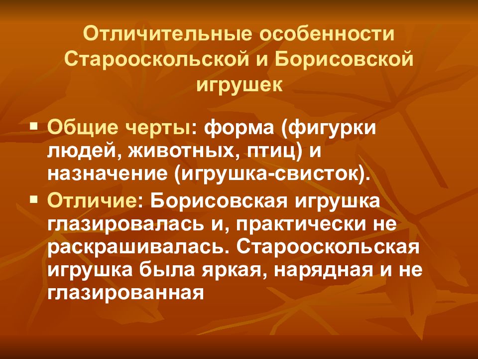 Общие черты : форма (фигурки людей, животных, птиц) и назначение (игрушка-свисток). Отличие : Борисовская игрушка глазировалась и, практически не раскрашивалась. Старооскольская игрушка была яркая, нарядная и не глазированная
