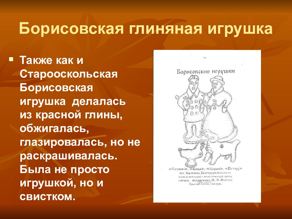 Также как и Старооскольская Борисовская игрушка делалась из красной глины, обжигалась, глазировалась, но не раскрашивалась. Была не просто игрушкой, но и свистком.