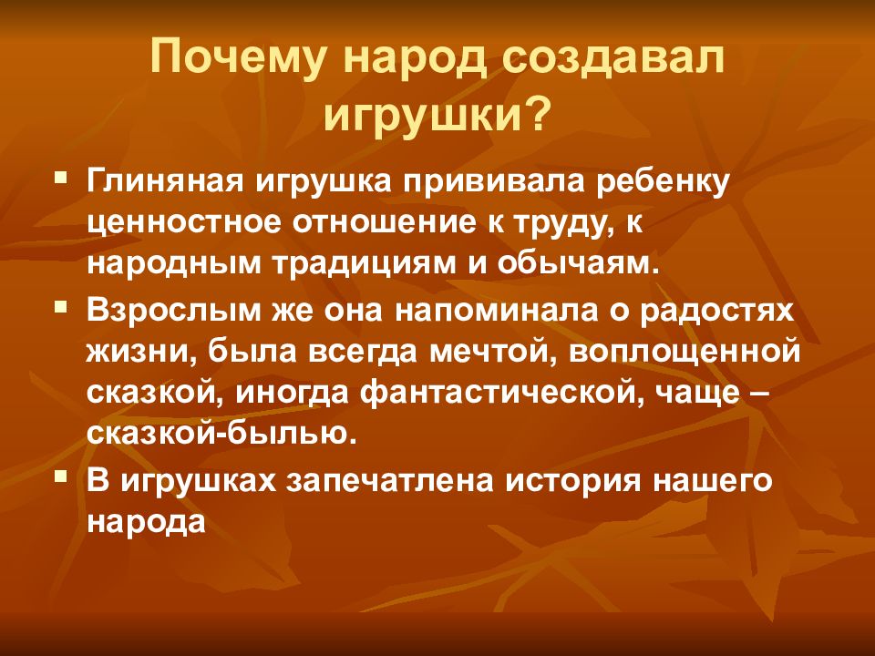 Глиняная игрушка прививала ребенку ценностное отношение к труду, к народным традициям и обычаям. Взрослым же она напоминала о радостях жизни, была всегда мечтой, воплощенной сказкой, иногда фантастической, чаще – сказкой-былью. В игрушках запечатлена история нашего народа