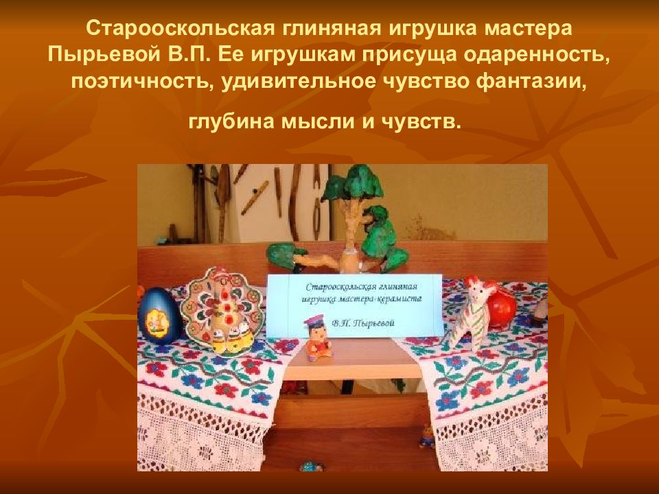 Слайд 17: Старооскольская глиняная игрушка мастера Пырьевой В.П. Ее игрушкам присуща одаренность, поэтичность, удивительное чувство фантазии, глубина мысли и чувств