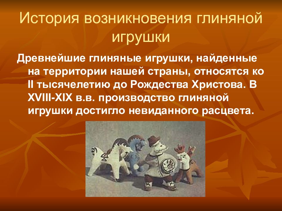 Древнейшие глиняные игрушки, найденные на территории нашей страны, относятся ко II тысячелетию до Рождества Христова. В XVIII-XIX в.в. производство глиняной игрушки достигло невиданного расцвета.