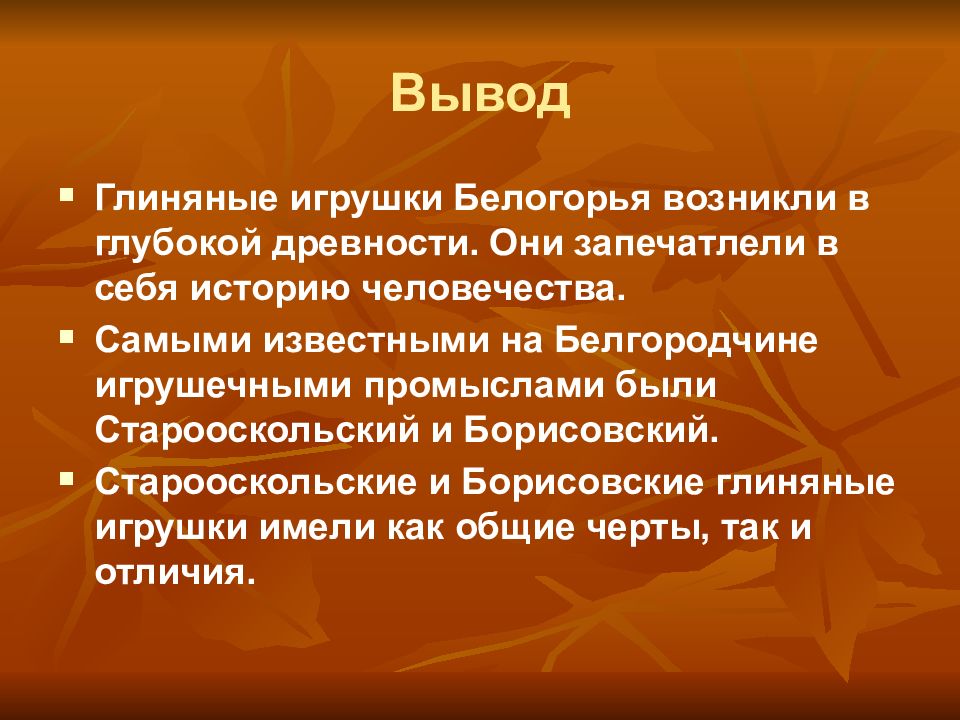 Глиняные игрушки Белогорья возникли в глубокой древности. Они запечатлели в себя историю человечества. Самыми известными на Белгородчине игрушечными промыслами были Старооскольский и Борисовский. Старооскольские и Борисовские глиняные игрушки имели как общие черты, так и отличия.