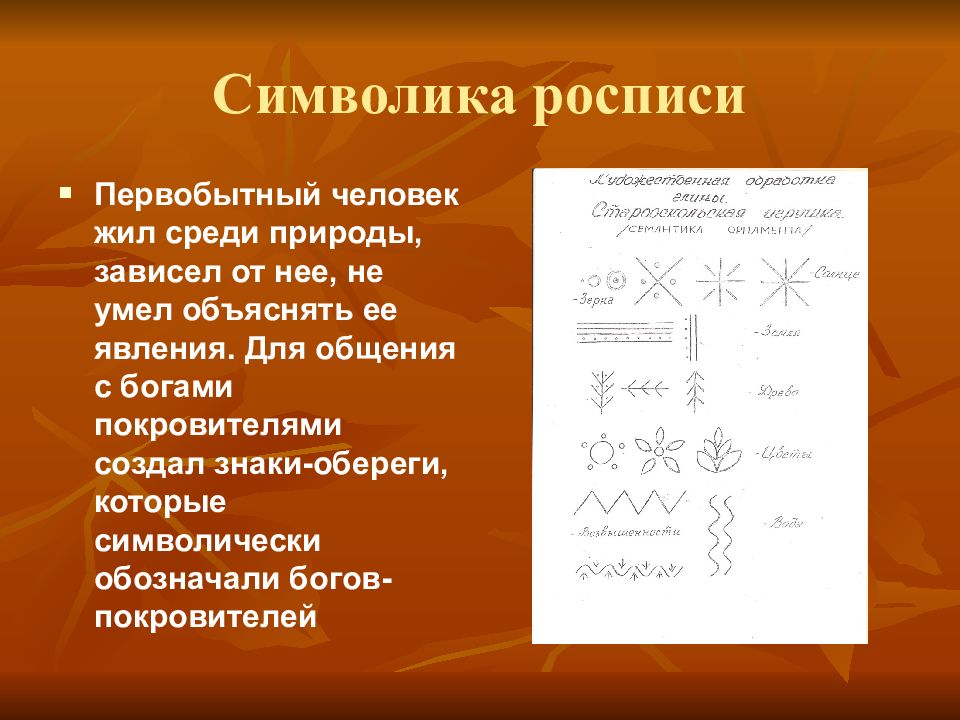 Первобытный человек жил среди природы, зависел от нее, не умел объяснять ее явления. Для общения с богами покровителями создал знаки-обереги, которые символически обозначали богов-покровителей