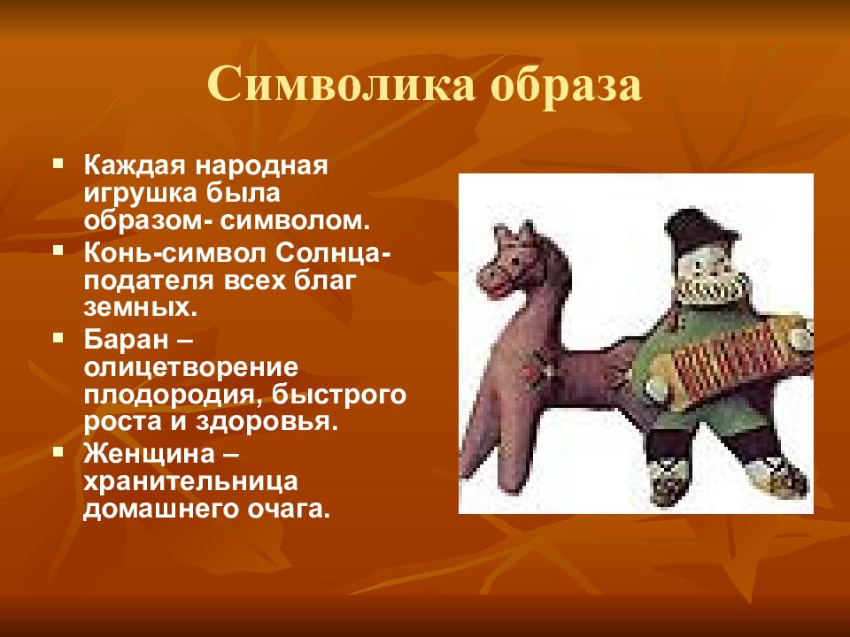 Каждая народная игрушка была образом- символом. Конь-символ Солнца-подателя всех благ земных. Баран – олицетворение плодородия, быстрого роста и здоровья. Женщина – хранительница домашнего очага.