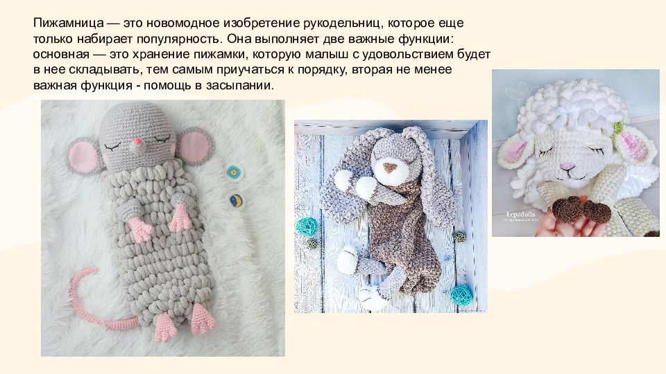 Пижамница — это новомодное изобретение рукодельниц, которое еще только набирает популярность. Она выполняет две важные функции: основная — это хранение пижамки, которую малыш с удовольствием будет в нее складывать, тем самым приучаться к порядку, вторая не менее важная функция - помощь в засыпании.