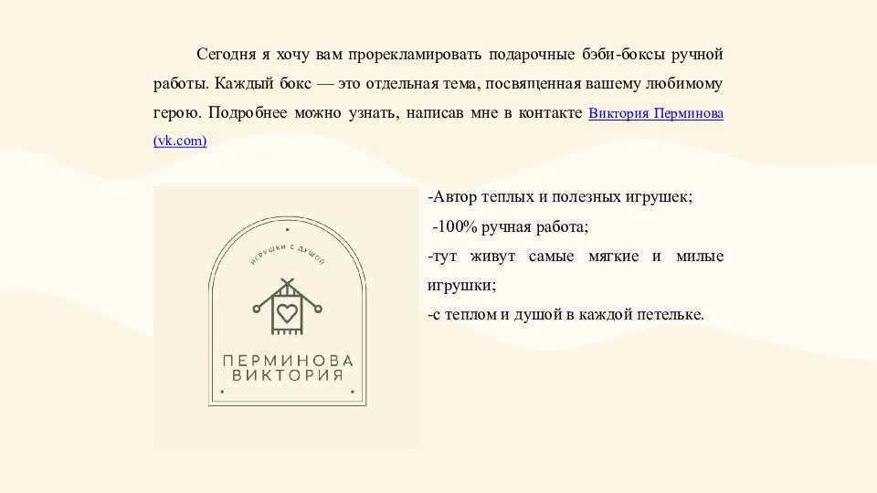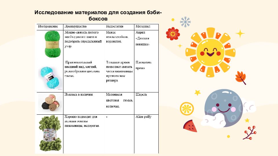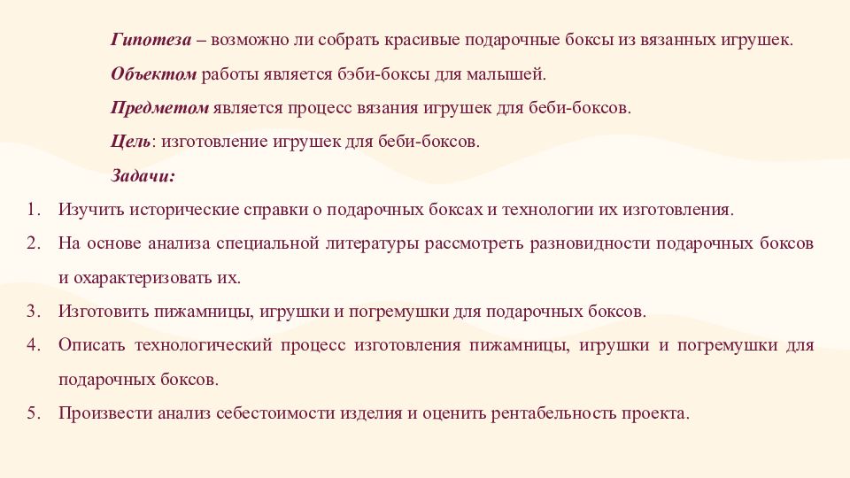 Гипотеза – возможно ли собрать красивые подарочные боксы из вязанных игрушек. Объектом работы является бэби-боксы для малышей. Предметом является процесс вязания игрушек для беби-боксов. Цель : изготовление игрушек для беби-боксов. Задачи: Изучить исторические справки о подарочных боксах и технологии их изготовления. На основе анализа специальной литературы рассмотреть разновидности подарочных боксов и охарактеризовать их. Изготовить пижамницы, игрушки и погремушки для подарочных боксов. Описать технологический процесс изготовления пижамницы, игрушки и погремушки для подарочных боксов. Произвести анализ себестоимости изделия и оценить рентабельность проекта.